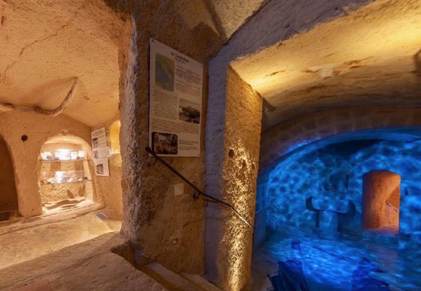 À l’intérieur du musée sont exposés des fossiles de différentes époques géologiques, imprimés ou emprisonnés dans le tuf, ainsi qu’une reproduction d’une partie du squelette de grands cétacés comme la baleine « Giuliana », découverte en 2006 sur les rives du barrage de San Giuliano, à quelques kilomètres de Matera. Ce sont quelques-uns des vestiges conservés au Musée de Paléontologie et de Géologie du territoire « Racconti in Pietra », aménagé par des particuliers dans un espace hypogé du Sasso Caveoso.